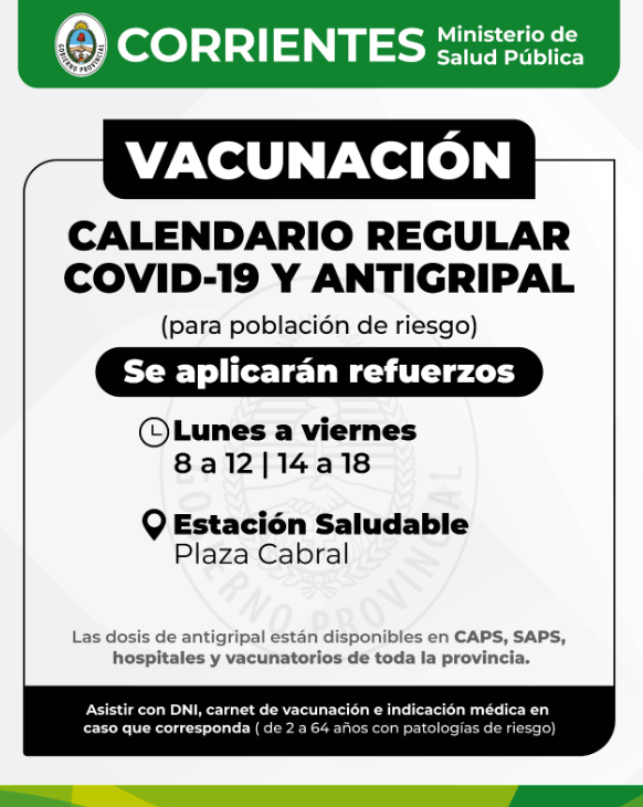 Las personas que se encuentran dentro del grupo de riesgo tienen que tener una dosis de antigripal y en cuanto a Covid-19, quienes hayan recibido su última dosis con un intervalo de 6 meses o más, deben concurrir a las vacunatorios, independientemente del número de aplicaciones con las que cuenten. Se recuerda también que las vacunas de calendario regular están disponibles en todos los centros de salud con vacunatorio.