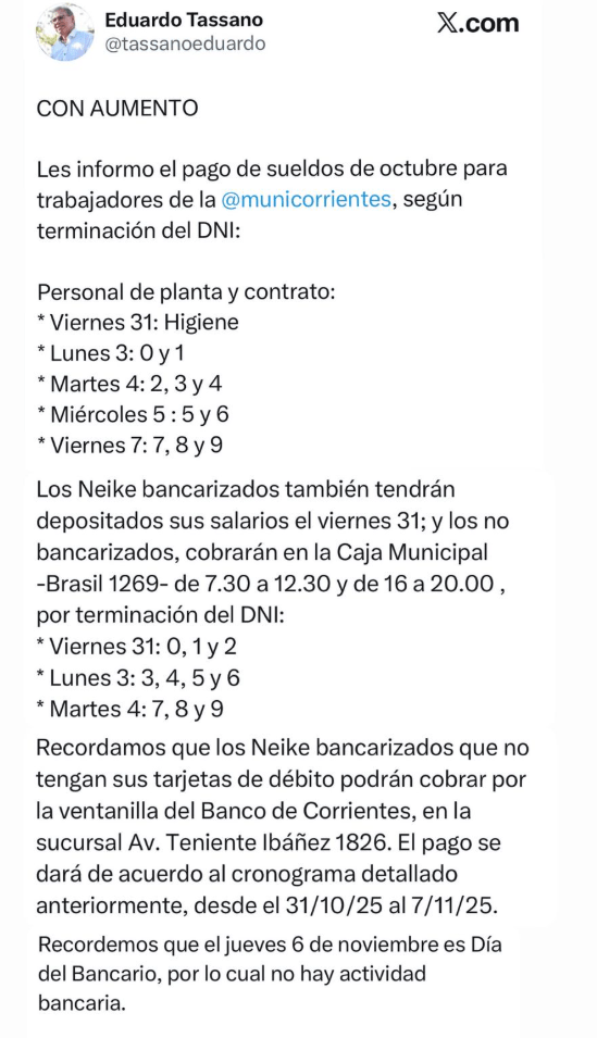 El cronograma salarial se extenderá hasta el 7 de noviembre -hay feriado bancario en medio-, según lo anunció el intendente Eduardo Tassano a través de sus redes sociales. Los haberes tendrán un incremento acordado en mesa paritaria de septiembre.