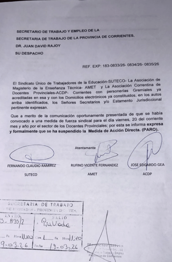 Ante la declaración de ilegalidad del paro por la Secretaría Trabajo de la provincia, y en resguardo a los docentes por la posibilidad de cesantía, se levanta la medida de fuerza. Se continúa con los reclamos a través de abogados laborales.