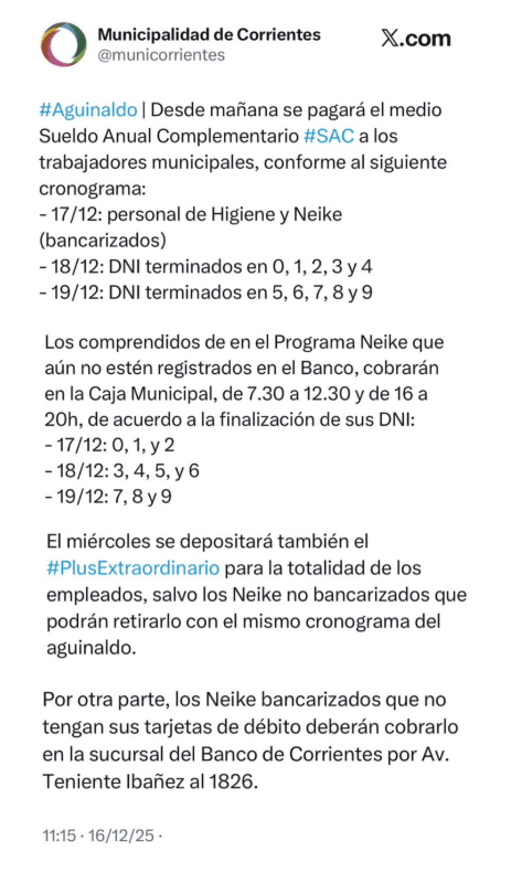En tanto, los Neike bancarizados, pero que no poseen tarjeta de débito, deberán cobrar por ventanilla del Banco de Corrientes (sucursal Av. Teniente Ibáñez 1826) de acuerdo al cronograma detallado anteriormente, que va del miércoles 17 al viernes 19 de diciembre.