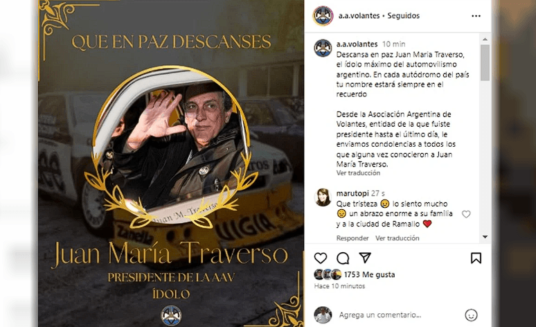 “Descansa en paz Juan María Traverso, el ídolo máximo del automovilismo argentino. En cada autódromo del país tu nombre estará siempre en el recuerdo”, publicó la Asociación de Volantes, al confirmar la muerte del “Flaco”. La entidad también le envió sus “condolencias a todos los que alguna vez conocieron” al piloto fallecido este sábado.