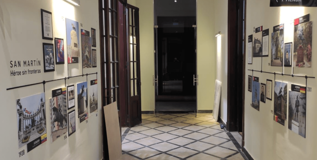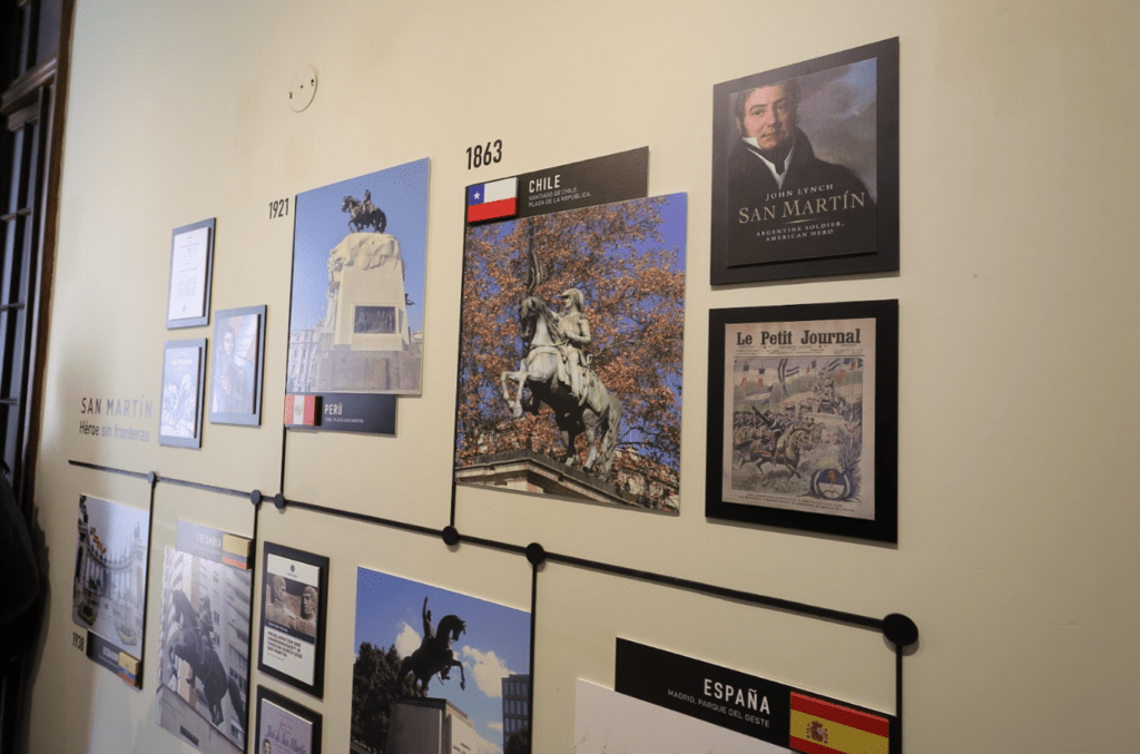 Una línea de tiempo representada en las paredes del edificio destaca sus hazañas, incluso las compara con las de Napoleón Bonaparte, y también exhibe el reconocimiento del Padre de la Patria en distintos países del mundo.