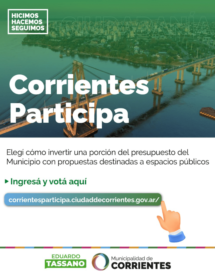 La ciudad de Corrientes da un paso adelante en la transformación digital. Con el lanzamiento de Corrientes Participa, la Municipalidad ofrece a los vecinos una herramienta efectiva y accesible para decidir sobre el destino de los fondos públicos, está disponible en http://corrientesparticipa.ciudaddecorrientes.gov.ar/