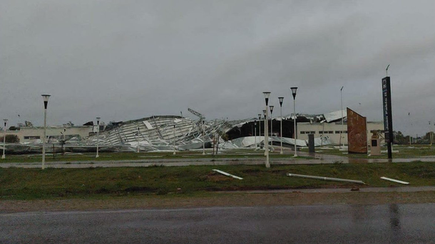 El polideportivo quedó reducido a chapas y columnas esparcidas por el predio, mientras que en la Terminal se cayó el techo y se detectaron quebraduras en las paredes y columnas.