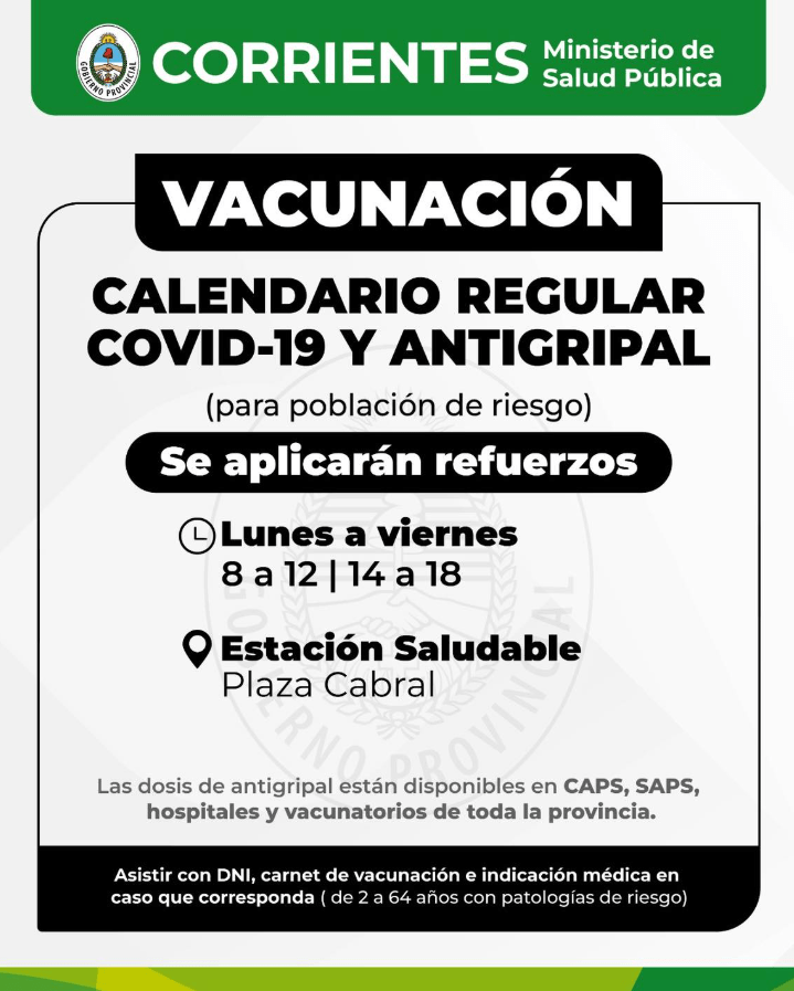 En la Capital, las dosis antigripales están disponibles en los Centros de Atención Primaria de la Salud (CAPS), en las Salas de Atención Primaria de la Salud (SAPS) de la Municipalidad de Corrientes y en los hospitales Ángela I. de Llano y pediátrico Juan Pablo II. En tanto, en el interior las dosis están disponibles en los distintos vacunatorios.