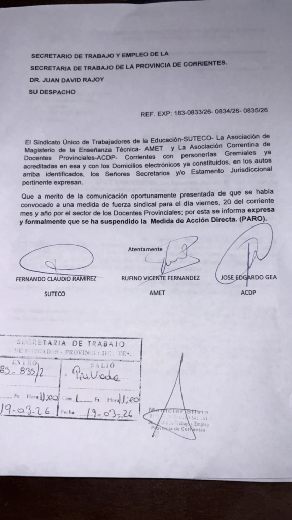 Ante la declaración de ilegalidad del paro por la Secretaría Trabajo de la provincia, y en resguardo a los docentes por la posibilidad de cesantía, se levanta la medida de fuerza. Se continúa con los reclamos a través de abogados laborales.