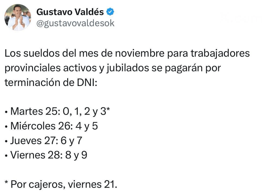El primer Mandatario provincial, Gustavo Valdés, confirmó el pago del sueldo de noviembre; el beneficio salarial alcanza a los agentes de la administración pública provincial, activos, jubilados y pensionados. Comienza este martes 25 y se extiende hasta el viernes 28, inclusive.