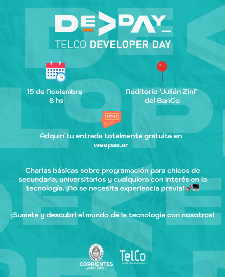 En un esfuerzo por fomentar la educación tecnológica en la comunidad, TelCo organiza el Dev Day 2024 en el Auditorio Julián Zini del Banco de Corrientes, un evento pensado para estudiantes de nivel secundario, universitario y para todo público interesado en la tecnología. Será este viernes 15 desde las 8.