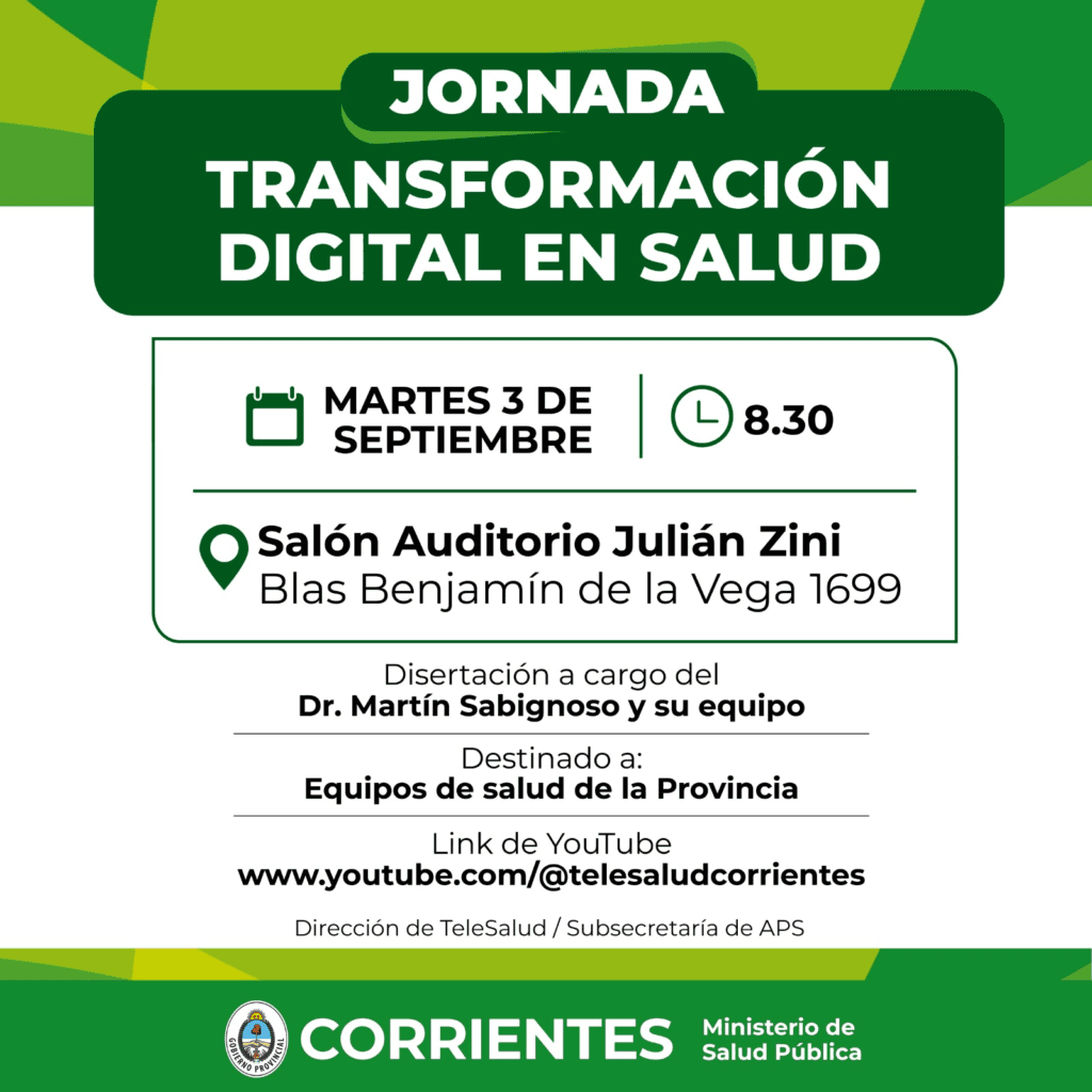 El martes 3 de septiembre el Ministerio de Salud Pública a través de la Dirección de Telesalud, realizará la Jornada “Transformación Digital del Sistema de Salud de Corrientes”. La disertación estará a cargo de especialistas de la Fundación Estudios e Investigaciones Administrativas en Salud (Feias). Se llevará adelante a partir de las 8.30 en el Auditorio Julián Zini ubicado por Blas Benjamín de la Vega 1699.