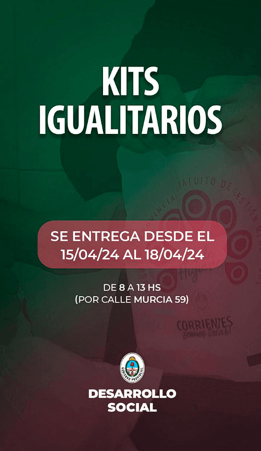 Como parte del programa “Gestión Menstrual”, el Gobierno provincial, a través del Ministerio de Desarrollo Social, hará entrega de los kits correspondientes del 15 al 18 de abril, de 8 a 13, en calle Murcia 59, en la ciudad de Corrientes, solicitando acudir con DNI.