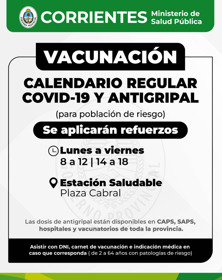 El Ministerio de Salud Pública de la Provincia, a través de la Dirección de Inmunizaciones, recuerda quiénes deben recibir la vacuna antigripal y refuerzos por Covid-19. Además, se insiste en completar el calendario de vacunación: las vacunas son gratuitas y están disponibles en los centros de salud con vacunatorio.