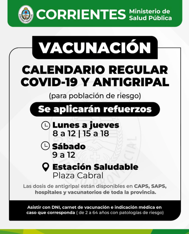 El Ministerio de Salud Pública de la Provincia, a través de la Dirección de Inmunizaciones, recuerda quiénes deben recibir la vacuna antigripal y refuerzos por Covid-19. Además, se insiste en completar el calendario de vacunación: las vacunas son gratuitas y están disponibles en los centros de salud con vacunatorios.