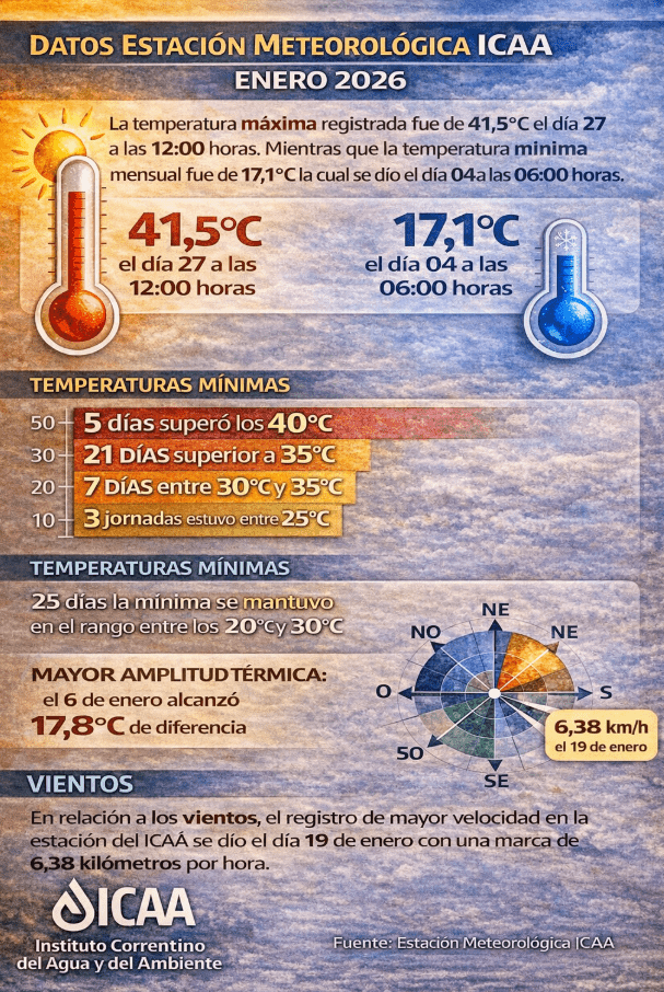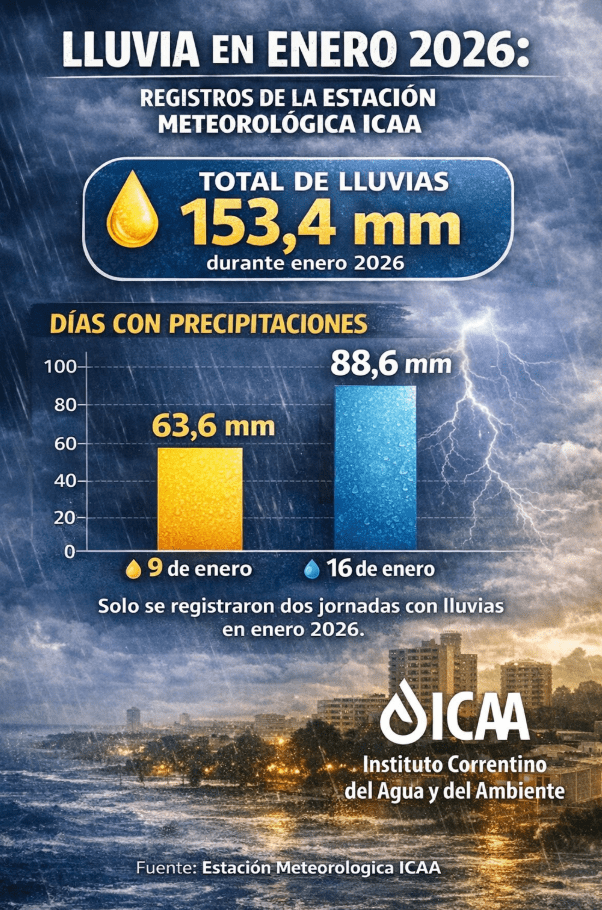 De acuerdo a los datos de la Estación Meteorológica ICAA, durante el mes de enero 2026 las lluvias alcanzaron en Corrientes capital un total de 153,4 milímetros. Mientras que la temperatura máxima registrada fue de 41,5ºC el día 27 a las 12:00 horas, y la temperatura mínima mensual fue de 17,1ºC el día 04 a las 06:00 horas.