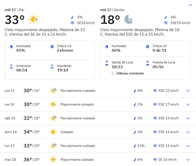 Por la tarde, la máxima llegará a los 32 °C, con probabilidad de tormentas aisladas (10-40%) y viento del Sureste de entre 13 y 22 km/h.