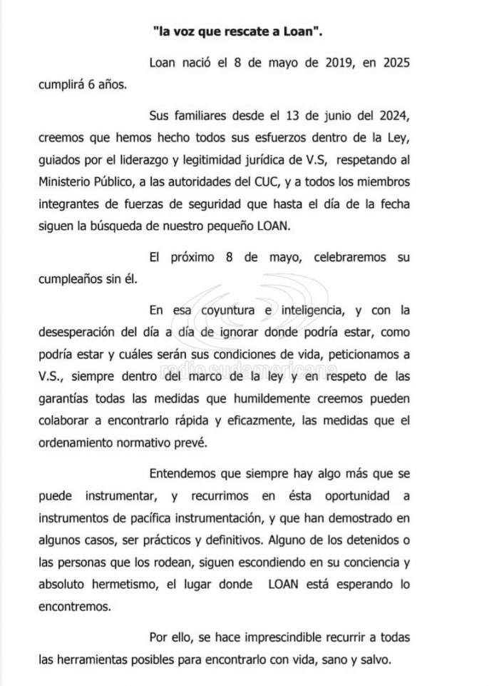 En el documento titulado “La voz que rescate a Loan”, proponen que alguno de los imputados aporte información para dar con el paradero de Loan Danilo Peña. El escrito se presentó el miércoles, antes del feriado del Día del Trabajador y la magistrada habría aceptado el pedido.