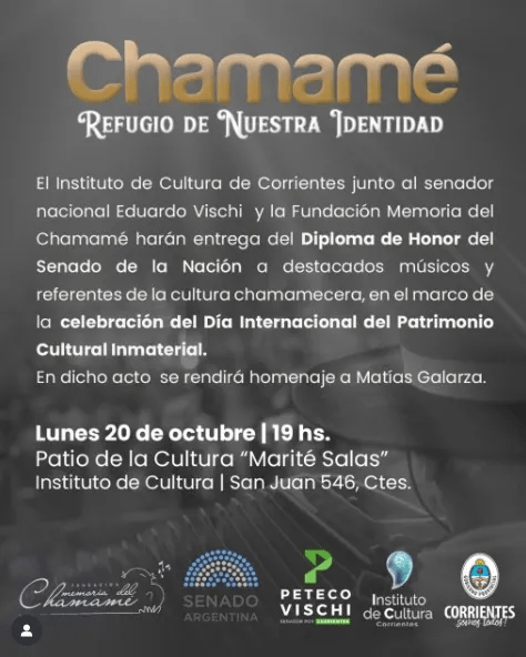 El acto central tendrá lugar el lunes 20 de octubre, a las 19, en el Patio de la Cultura Marité Salas (San Juan 546), donde se entregarán Diplomas de Honor a grandes referentes del chamamé por su invaluable aporte a la música y la identidad correntina.