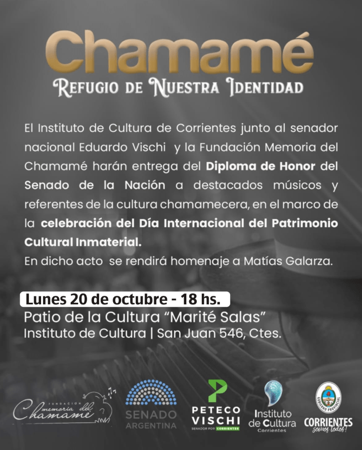 Organizado por el Instituto de Cultura de Corrientes junto al senador nacional Eduardo Vischi y la Fundación Memoria del Chamamé se llevará adelante esta actividad en el marco de la celebración del Día Internacional del Patrimonio Cultural Inmaterial (17 de octubre – declarado por la UNESCO), y como parte del ciclo “Patrimonio Vivo de Corrientes: celebrando nuestro legado”.