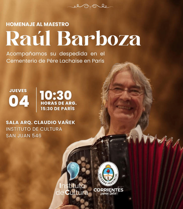 El Gobierno de la Provincia, a través del Instituto de Cultura de Corrientes, rendirá un sentido tributo a uno de los grandes embajadores del chamamé: el maestro Raúl Barboza. Este jueves 4 de septiembre, a las 10,30, se realizará un homenaje al músico en la Sala Vañek (San Juan 546), acompañando simbólicamente la despedida a sus restos en Francia.