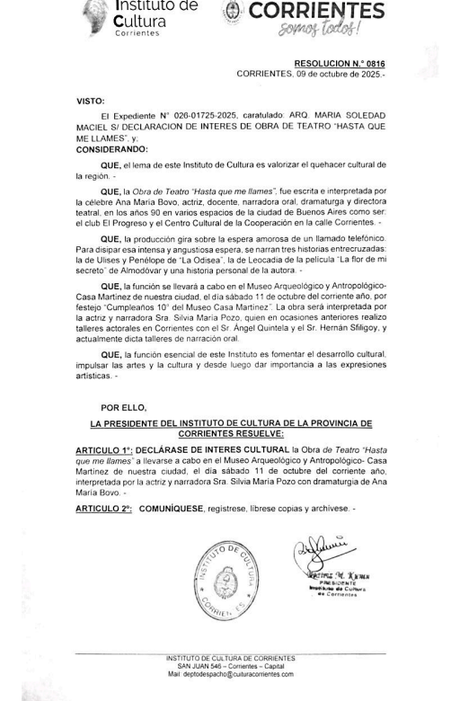 El pasado sábado 25 de octubre nuevamente el Museo Arqueológico de la Provincia de Corrientes – Casa Martínez abrió sus puertas al teatro, al arte escénico de la mano de la obra “Hasta que me llames” , monólogo protagonizado por Silvia Pozo, escrita y con asistencia técnica de Ana María Bovo .
