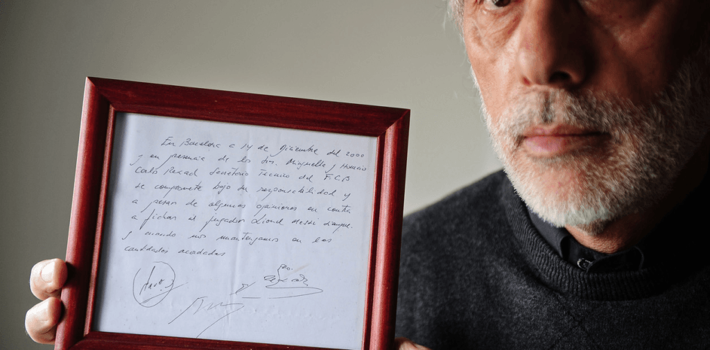 En aquella reunión se firmó en una servilleta el primer contrato de La Pulga, donde quedó establecido que entraba a las inferiores del club blaugrana. “En Barcelona, a 14 de Diciembre del 2000 y en presencia de los Sres. Minguella y Horacio (Gaggioli), Carles Rexach, Secretario Técnico del F.C.B., se compromete bajo su responsabilidad y a pesar de algunas opiniones en contra a fichar al jugador Lionel Messi siempre y cuando nos mantengamos en las cantidades acordadas”, narraba la servilleta.