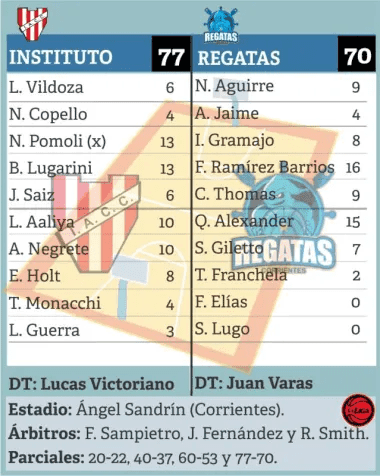 Ante los aciertos del dueño de casa, Regatas mostró corazón para ir a buscar y, con un triple de Ramírez Barrios, se ilusionó quedando en partido (73-65) con 3:47 por delante. Pero Instituto fue inteligente para cerrarlo en la línea con Alex Negrete (77-70) para celebrar ante sus hinchas en el Sandrín.