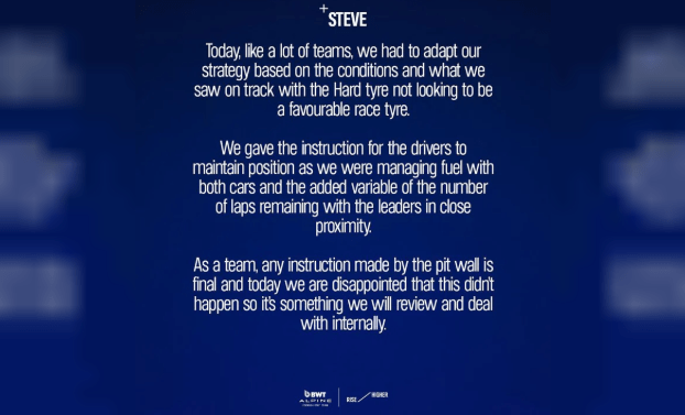 La escudería explicó que le dieron instrucciones a sus dos competidores para que mantuvieran la posición. Una frase que pone en apuros a Colapinto, quien desobedeció las indicaciones del equipo técnico de Alpine.