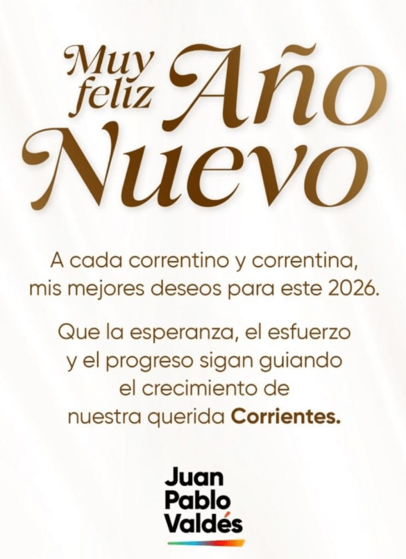 En el marco de las celebraciones por el inicio de un nuevo año, el gobernador Juan Pablo Valdés hizo llegar un afectuoso saludo a la ciudadanía a través de sus redes sociales. El mandatario se dirigió a “cada correntino y correntina” para expresar sus augurios de cara al 2026.