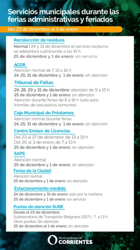 La Municipalidad de Corrientes informa acerca del funcionamiento que tendrán sus diferentes dependencias entre el 23 de diciembre y el 5 de enero, en virtud de la feria administrativa extraordinaria dispuesta por el intendente, Eduardo Tassano, así como por las fiestas de Navidad y Fin de Año.