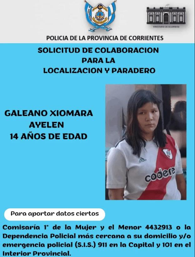 Desde Jefatura de Policía solicitan colaboración para dar con la menor de 14 años identificada como Xiomara Ayelen Galeano quien conforme a la denuncia efectuada por una mujer de apellido –Delgado- ante autoridades de la comisaría Primera, la joven se ausentó del hogar ” María de Nazareth Laura Vicuña”.