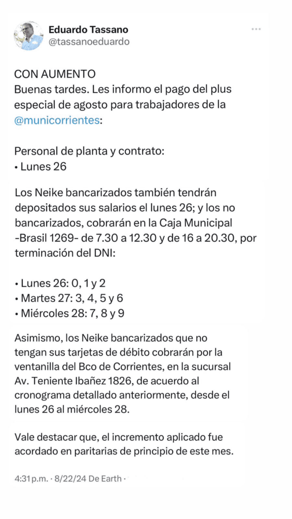 El cronograma se extenderá hasta el miércoles 28, según anunció el intendente Eduardo Tassano a través de sus redes. En este caso, se aplica un incremento acordado en paritarias de principios de este mes.