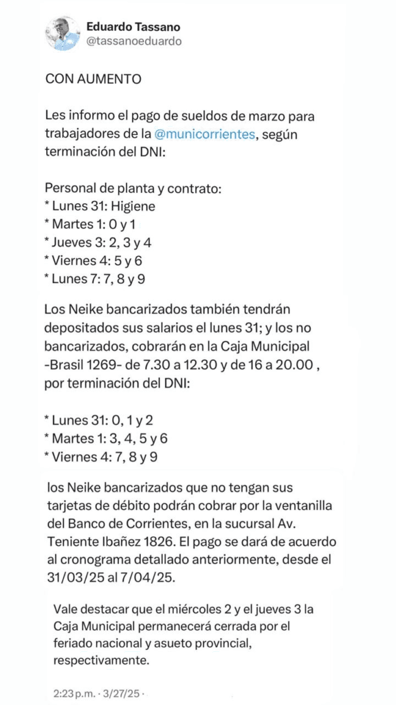 El cronograma salarial de marzo se extenderá hasta el 7 de abril, teniendo en cuenta el feriado nacional del 2 de abril, según lo anunció el intendente Eduardo Tassano a través de sus redes sociales. En este caso se aplica el incremento del 30% en el básico, el primero de los tres aumentos en el año acordados en la Mesa Paritaria de mediados del mes.