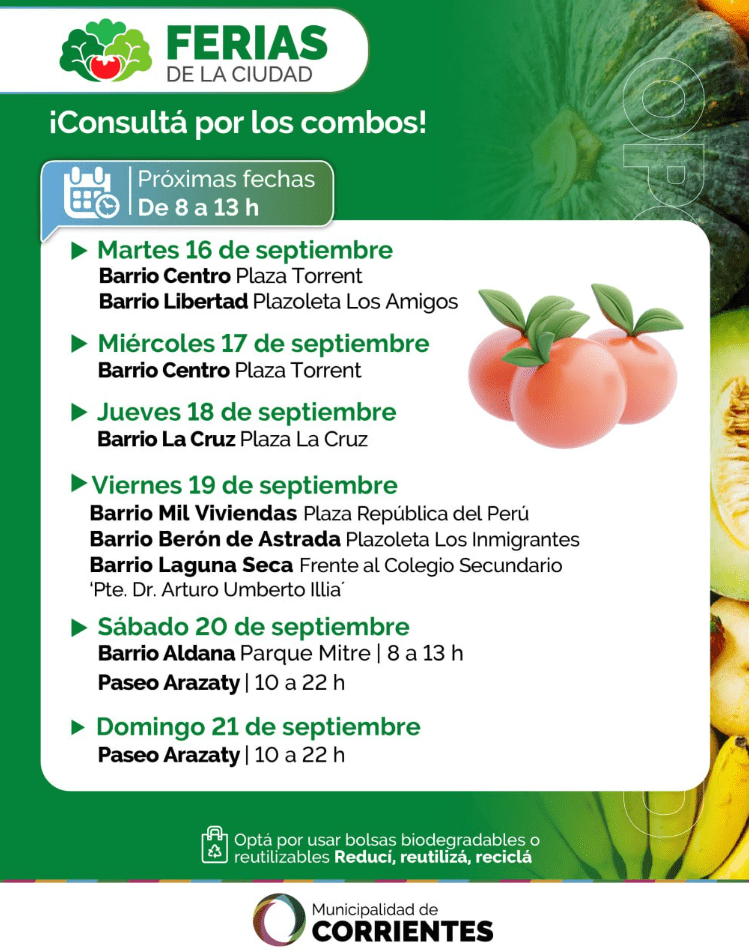 Entre el martes 16 y el domingo 21 de septiembre, las ferias itinerantes organizadas por la Municipalidad volverán a realizar su habitual recorrido por los barrios de Corrientes con su oferta de productos de calidad y mejores precios. Los vecinos podrán adquirir frutas y verduras, productos manufacturados, artesanías, plantas ornamentales, entre otras propuestas.