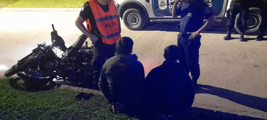 Personal de la Comisaría Seccional Sexta de Goya demoró a dos individuos encapuchados, sospechados de haber cometido el robo de una motocicleta. El hecho se desencadenó cuando un móvil policial identificó a los sujetos circulando por la zona de Tucumán y Alemania. Al notar la presencia de la Policía, intentaron escapar, pero en plena huida terminaron cayendo tras colisionar entre sí sobre calle Belgrano.