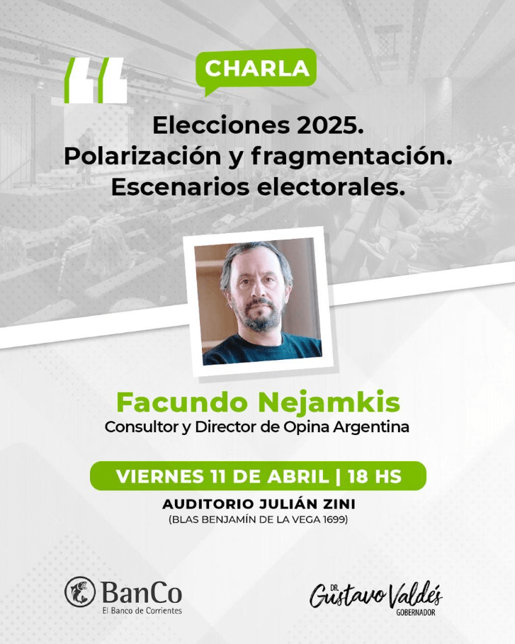 Convocado por el Banco de Corrientes y el Gobierno provincial, el consultor y director de Opina Argentina, Facundo Nejamkis brindará este viernes la charla: “Elecciones 2025, polarización y fragmentación: escenarios electorales”.