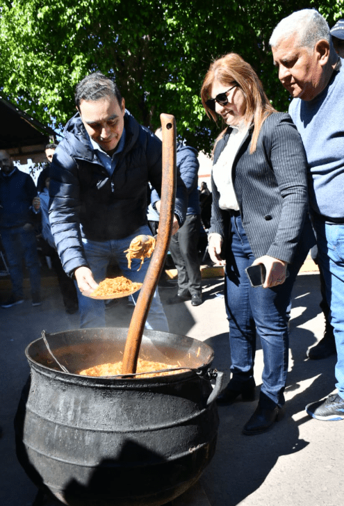 Durante la jornada, el mandatario recorrió el predio ferial, saludó a las familias que compartían la mesa y dialogó con los cocineros que trabajaron en la preparación del almuerzo, reconociendo el esfuerzo y dedicación que hacen posible esta fiesta. Allí, se sentó junto a los vecinos del pueblo degustando los platos de turno, como el guiso y el cordero a la estaca, ícono gastronómico de la celebración, resaltando el valor de la producción ovina y la identidad culinaria de la región.