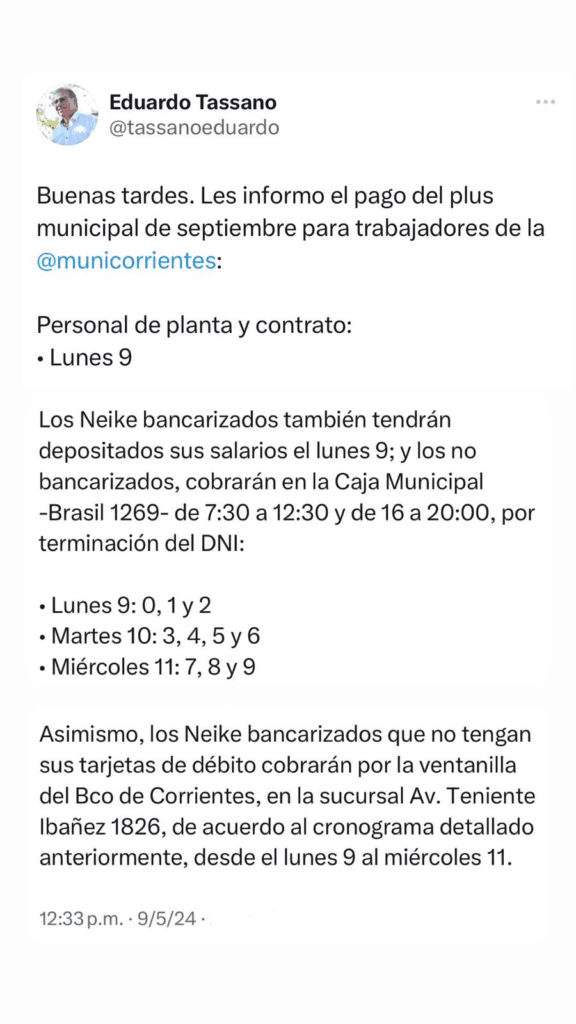El cronograma de este plus ordinario de septiembre se extenderá hasta el miércoles 11, según anunció el intendente Eduardo Tassano a través de sus redes.