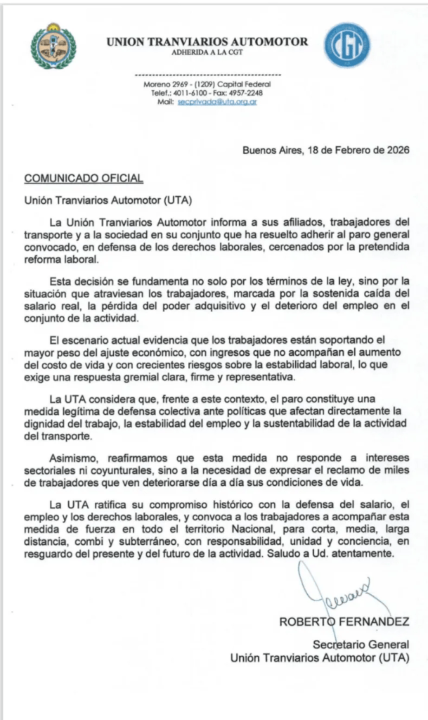 Este miércoles 18 de febrero, la CGT confirmó que llevará a cabo un paro total de 24 horas en rechazo de la reforma laboral. Este se realizará el mismo día en que Diputados traten el proyecto de ley oficialista que se llevará a cabo este jueves 19 de febrero a las 14 h.
