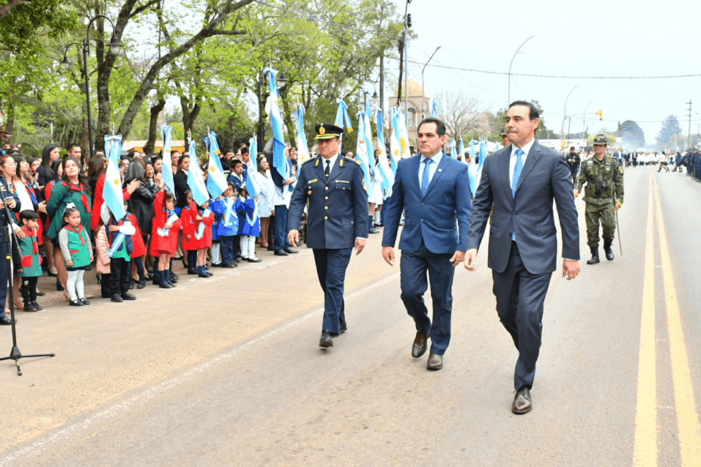 Acompañado por el intendente Pedro Maidana, el mandatario provincial se dirigió, inicialmente, hacia el palco oficial emplazado para presidir la ceremonia programada con un posterior y tradicional desfile Cívico- Militar, sobre Ruta Nacional Nº 118.