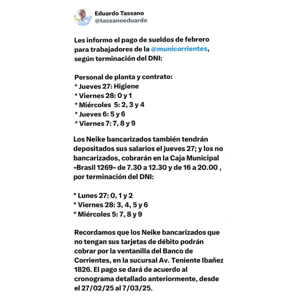 Por los feriados de Carnaval del próximo lunes y martes, el cronograma salarial de febrero se extenderá hasta el viernes 7 de marzo, según lo anunció el intendente Eduardo Tassano a través de sus redes sociales.