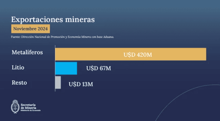 En noviembre de 2024, los minerales metalíferos representaron el 84,0% de las exportaciones mineras, mientras que el litio aportó un 13,4%.