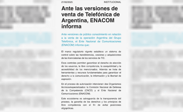 Ante las versiones de venta de Telefónica de Argentina, ENACOM informa