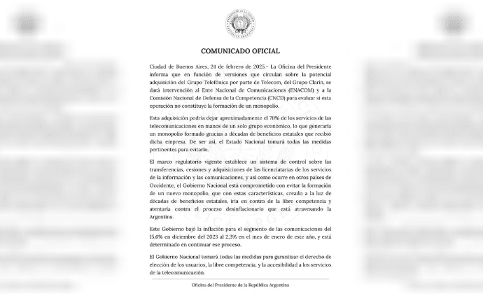 Ciudad de Buenos Aires, 24 de febrero de 2025.- La Oficina del Presidente informa que en función de versiones que circulan sobre la potencial adquisición del Grupo Telefónica por parte de Telecom, del Grupo Clarín, se dará intervención al Ente Nacional de Comunicaciones (ENACOM) y a la Comisión Nacional de Defensa de la Competencia (CNCD) para evaluar si esta operación no constituye la formación de un monopolio.
