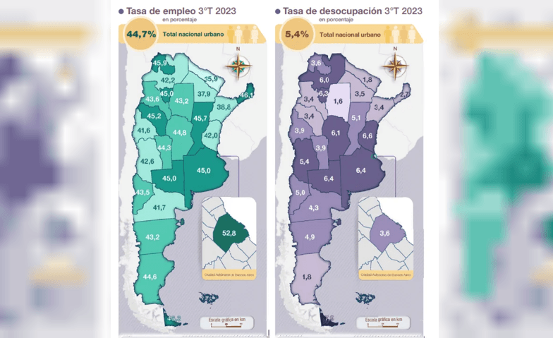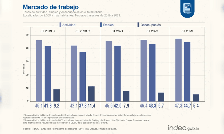 Tanto la tasa de actividad (47,3%), como la tasa de empleo (44,7%), y la desocupación (5,4%), tuvieron en el tercer trimestre del 2023, los mejores datos de los últimos 5 años, según reflejó esta jornada el INDEC.