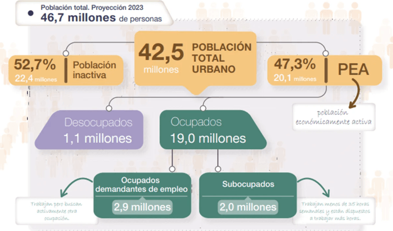 De 42,5 millones de personas, el 52,7% es parte de la población inactiva frente al 47,3% de población económicamente activa.