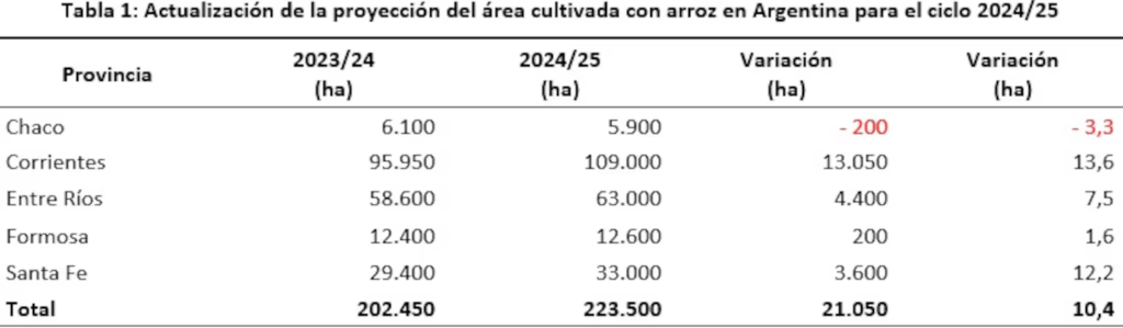 Asociación Correntina de Plantadores de Arroz, la Bolsa de Comercio del Chaco (BCCH), EEA INTA Corrientes, AER INTA San Javier, AER INTA Las Palmas y la Bolsa de Cereales de Entre Ríos (SIBER), la superficie sembrada aumentará un 10,4% respecto al ciclo anterior, lo que refleja un notable interés por parte de los productores en esta actividad agrícola.