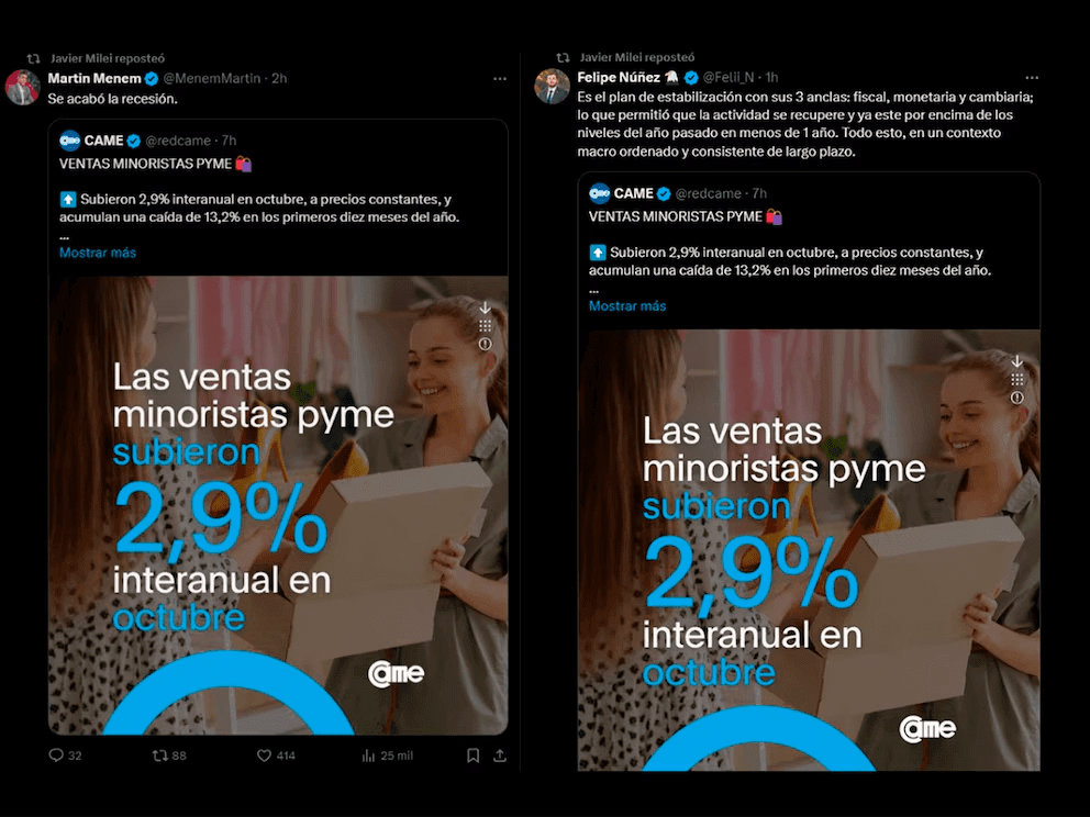 Luego de que un informe de CAME consignó que en octubre las ventas pymes registraron el primer aumento interanual en casi dos años, el presidente reposteó los mensajes en redes sociales del diputado Martín Menem y de un miembro del equipo económico.