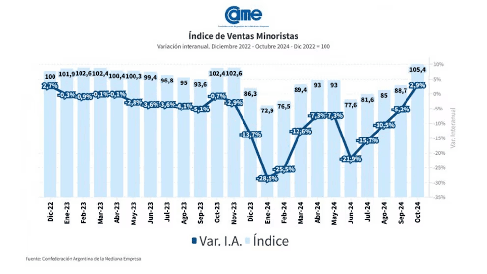 Sin embargo, CAME señala que el acumulado de ventas de los primeros diez meses de 2024 el nivel de ventas registra un retroceso de 13,2% y que los empresarios del sector piden fortalecer la demanda interna (11,4% de las respuestas) e incentivos para la contratación de personal (6,8%), según surge de su relevamiento.