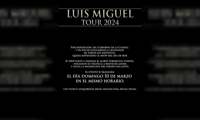 El Gobierno de la Ciudad anunció esta noche la suspensión de todos los recitales al aire libre previstos para esta noche, incluido el muy esperado show de Luis Miguel, debido a un alerta meteorológico naranja emitido por el Servicio Meteorológico Nacional (SMN).