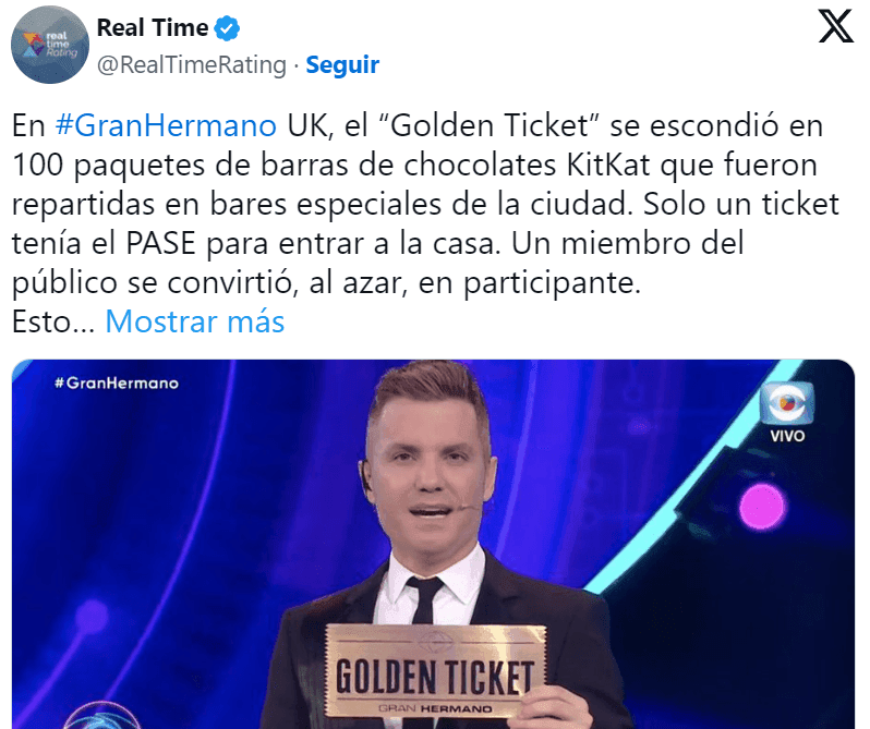 La cuenta de Twitter “RealTime”, contó qué puede ocurrir con ese Golden ticket. “En GranHermano UK, el “Golden Ticket” se escondió en 100 paquetes de barras de chocolates KitKat que fueron repartidas en bares especiales de la ciudad”, comenzó diciendo.