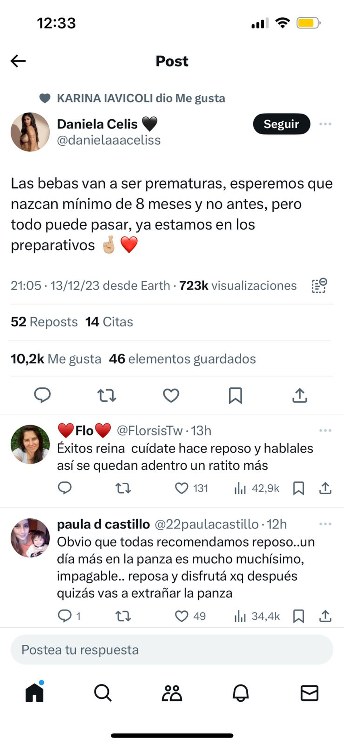 “Las bebas van a ser prematuras”, confirmó Celis en la red social de X, ex twitter. Entonces, mostró su angustia ante la confirmación del nacimiento adelantado: “Esperamos mínimo que nazcan de 8 meses”.